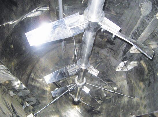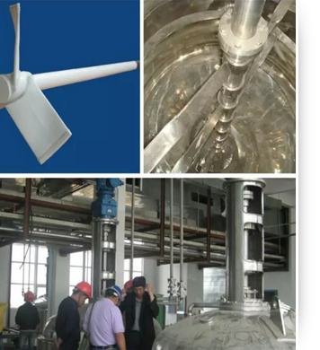 脫色罐:主要攪拌目的是物料輕輕攪動(dòng)脫色,低轉(zhuǎn)速大直徑的轉(zhuǎn)動(dòng),不能使物料大范圍的攪拌以破壞脫色效果。使用的槳葉形式有:斜葉槳式(XJ、HJ、QJ等)。