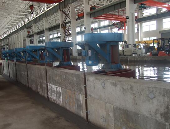 浸出槽是礦山冶金主要設(shè)備之一,用攪拌器使物料在溶液中處于懸浮狀態(tài)的浸出方法。物料和浸出劑按一定的比例調(diào)漿,調(diào)成的礦漿密度一般為10%~50%。在浸出過程中,利甩設(shè)置在攪拌槽中的攪拌裝置使空氣與固體液體充分接觸混合均勻以及固體顆粒懸浮。旋槳式ZCX,斜葉槳式(XJ、HJ),開啟渦輪式(XKK,MK,ZK)。