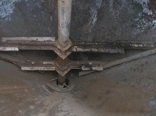濃磷酸沉降槽是磷銨裝置的主要設(shè)備,主要使用刮泥機(jī)將濃縮后的磷酸收集,這個(gè)過程中容易出現(xiàn)筒底錐部的集料導(dǎo)致壓耙現(xiàn)象,需停車修理。我公司設(shè)計(jì)的刮泥機(jī)具有扭矩控制系統(tǒng),在扭動(dòng)達(dá)到設(shè)計(jì)值之后,攪拌軸與耙壁自動(dòng)提升,等錐底部物料松動(dòng)扭動(dòng)下降,則攪拌軸與耙壁自動(dòng)下降繼續(xù)工作,有效的避免了壓耙現(xiàn)場(chǎng)。